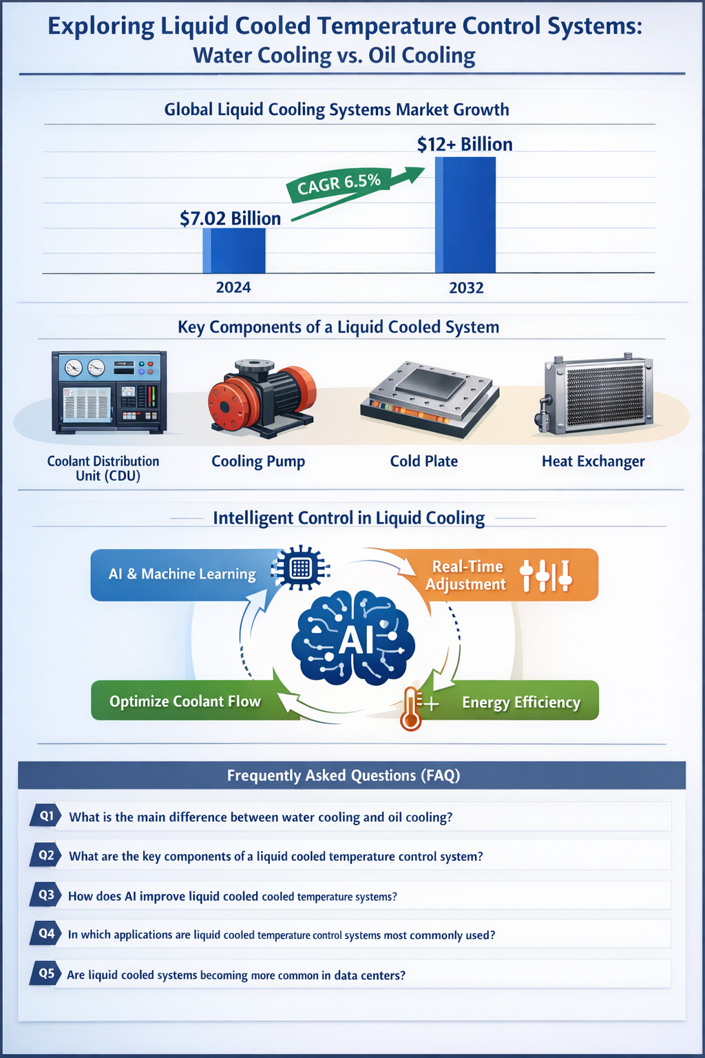 Управление температурным режимом — это широкое понятие в электронике и промышленных системах, охватывающее различные методы охлаждения, такие как воздушное охлаждение, жидкостное охлаждение, тепловые трубки и материалы с фазовым переходом. Среди них жидкостное охлаждение привлекло внимание благодаря своей более высокой эффективности теплопередачи и способности поддерживать стабильные рабочие температуры в высокопроизводительных приложениях. Системы контроля температуры с жидкостным охлаждением (Вы можете нажать здесь) широко используются в центрах обработки данных, высокопроизводительных вычислениях, аккумуляторах электромобилей и промышленном оборудовании. Мировой рынок систем жидкостного охлаждения оценивается примерно в 7 миллиардов долларов США в 2024 году и, по прогнозам, к 2032 году достигнет более 12 миллиардов долларов США, что обусловлено спросом на эффективные решения по управлению температурным режимом.